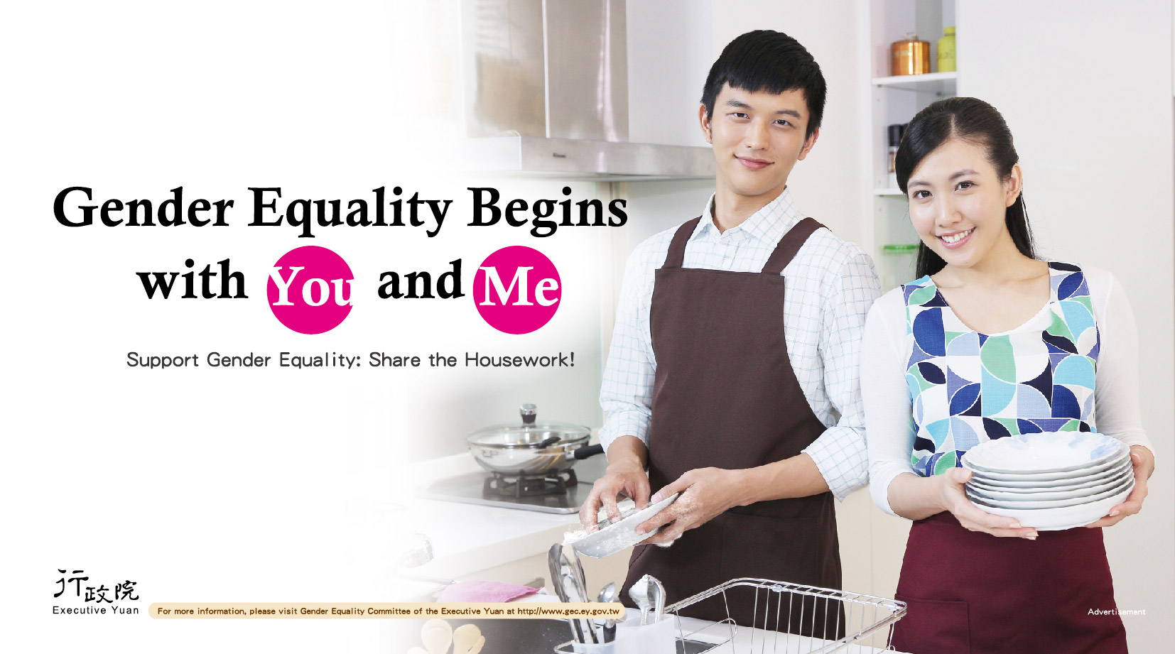 4.「家務分工篇」:透過男女性在廚房「共同分擔家事」的畫面呈現,表示做家事不再侷限於一般傳統刻板印象中的女性,願意分擔家事的男人是重視性別平等的具體表現,藉此呼應主標語「性別平等,從你我做起」的概念。