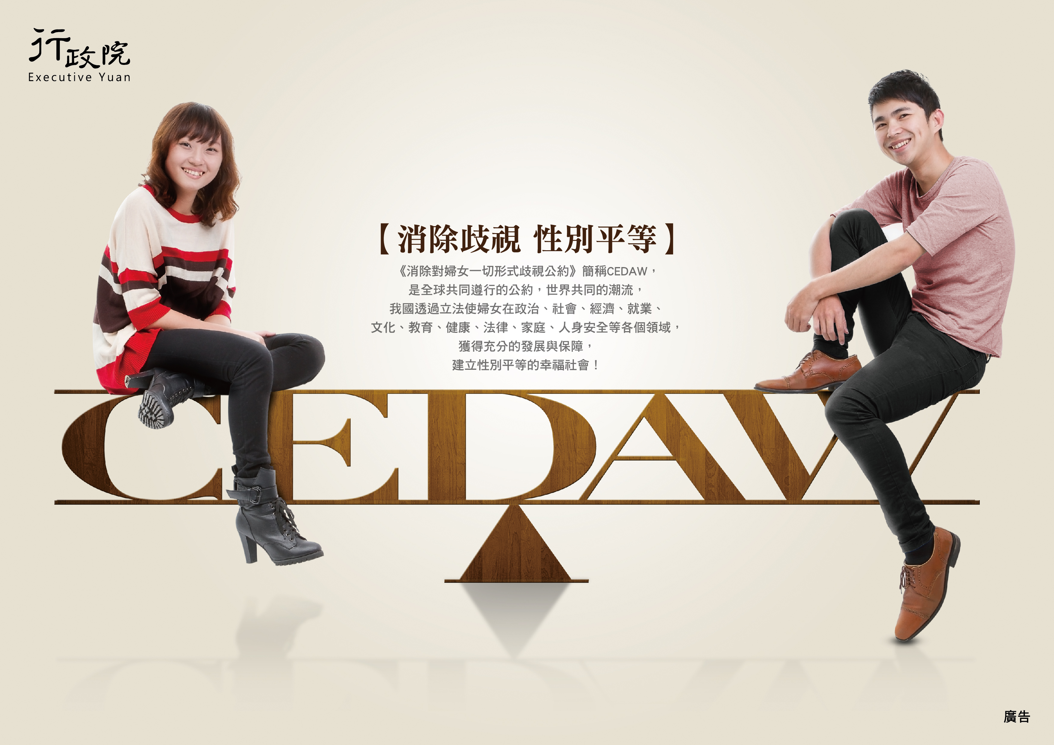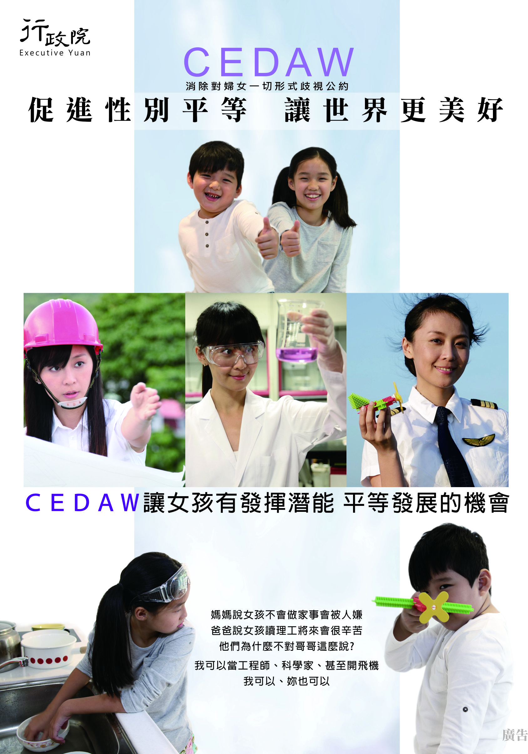 1.「位置篇」:消除性別歧視是國際社會潮流。我國透過立法保障婦女在各領域的基本權益,讓婦女在社會上能夠平等參與、共治共決,獲得平等發展的機會,擁有屬於自己的位置。CEDAW上路,需要你我共同協力來成就性別平等的友善社會。